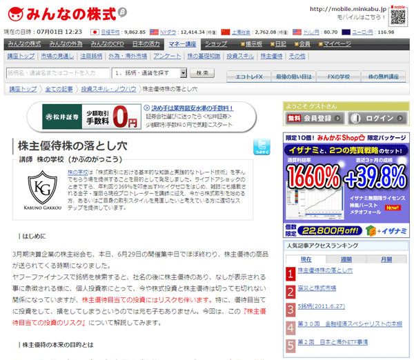 2011年6月30日 株の学校ドットコムのコラムが、Yahoo!ファイナンス、みんなの株式に掲載されました。