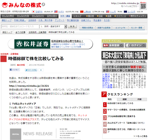 2011年7月21日 株の学校ドットコムのコラムが、Yahoo!ファイナンス、みんなの株式に掲載されました。